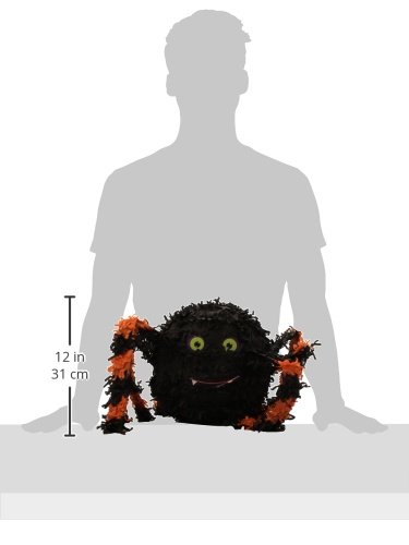 Cette pinata Halloween mesure environ 24 cm de hauteur. Elle représente une araignée de couleur noir avec les pattes rayées orange.
